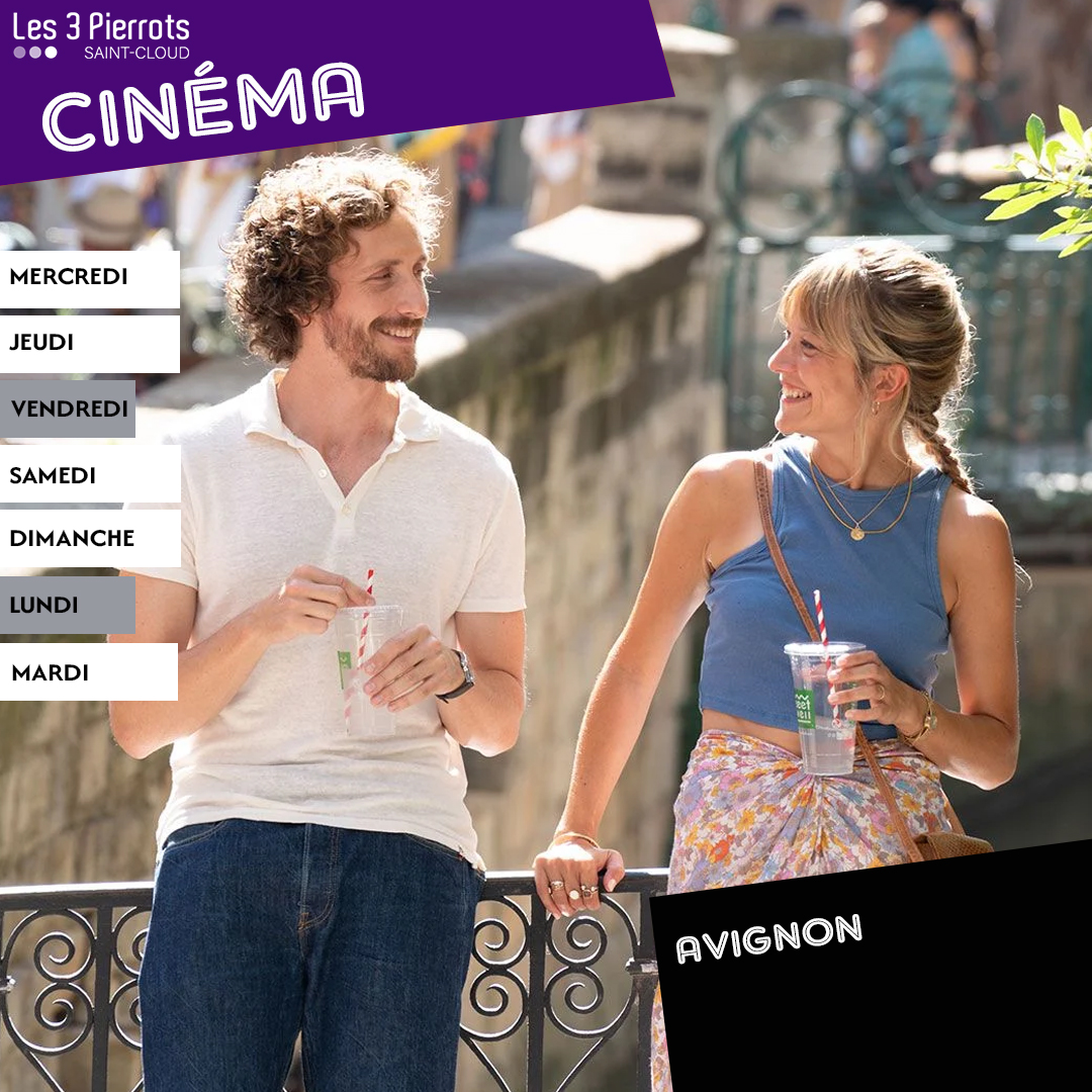 02 juil 08 juil Du Mercredi 2 juillet 2025 au Mardi 8 juillet 2025 Cinéma Les 3 Pierrots Du 2 au 8 juillet Column 2 contentColumn 2 contentColumn 2 contentColumn 2 contentColumn 2 contentJURASSIC WORLD : RENAISSANCE v.o.États-Unis – 2h13 - AventureRéalisé par Gareth EdwardsUne expédition brave des régions équatoriales isolées pour extraire de l’ADN de trois créatures préhistoriques.Ven : 20h30 | Sam : 11h, 15h45, 20h30Dim : 11h, 18h, 20h45 | Lun : 14h, 20h30 | Mar : 14h AMÉLIE ET LA MÉTAPHYSIQUE DES TUBESÀ partir de 6 ansSélection, Festival de Cannes 2025France - 1h16 – AnimationRéalisé par Maïlys Vallade et Liane-Cho HanAmélie est une petite fille belge née au Japon. Grâce à son amie Nishio-san, le monde n’est qu’aventures et découvertes.Mer : 16h30 | Sam : 11h15, 14h | Dim : 11h15, 14hLun : 14h15 | Mar : 14h15AVIGNONGrand Prix, Festival de l’Alpe d’Huez 2025France - 1h40 - Comédie romantiqueRéalisé par Johann DionnetComédien en perte de vitesse, Stéphane débarque avec sa troupe au Festival d’Avignon pour jouer une pièce de boulevard.Mer : 14h, 20h45 | Jeu : 20h45 | Sam : 13h45, 20h45Dim : 16h | Mar : 20h45 A NORMAL FAMILY v.o.Corée du sud – Drame, ThrillerRéalisé par Jin-Ho HurDeux frères se retrouvent régulièrement avec leurs épouses pour dîner dans un restaurant chic de Séoul.Sam : 18h30 | Dim : 15h4513 JOURS 13 NUITSMer : 14h30, 16h, 20h30 | Jeu : 20h30 | Ven : 20h45Sam : 16h, 18h15 | Dim : 13h45, 18h15, 20h30Lun : 20h45 | Mar : 20h30 Tous les spectacles