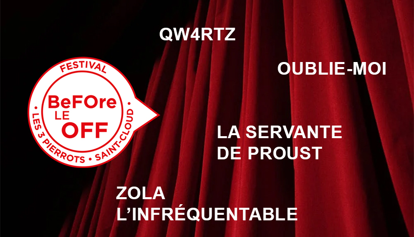 Les 3 Pierrots et son nouveau directeur Stéphane Boutet ont sélectionné des textes d’auteurs contemporains qui se joueront pour la première fois au Festival OFF d’Avignon en juillet prochain. Pour cette première édition, trois compagnies seront en résidence tout au long du mois de juin dans les salles des 3 Pierrots pour créer leur spectacle et offriront gratuitement au public de Saint-Cloud leur toute première représentation avant de partir en Avignon. Les spectacles sélectionnés arboreront ensuite sur leurs affiches le logo « Coup de cœur du festival BeFOre le OFF », gage de qualité qui donnera à ces créations plus de visibilité dans le festival OFF d’Avignon, tout en faisant connaitre et rayonner notre théâtre et notre ville. Pour clôturer cette première édition du Festival BeFOre le OFF, nous accueillerons Les Qu4rtz, LE groupe a cappella pop le plus célèbre du Québec qui se produira pour leur premier et unique concert en France aux 3 Pierrots.